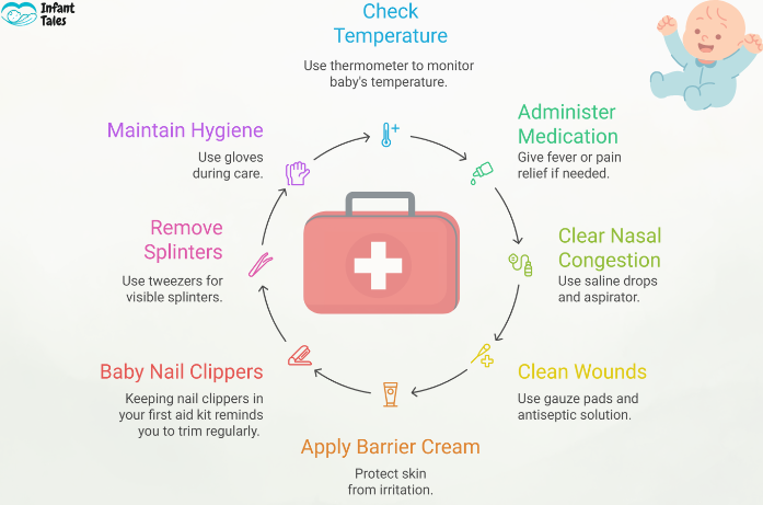 A newborn first aid kit often focuses more on temperature monitoring, nasal care, and skin protection, while older infants may need additional items as mobility increases. Over time, your supplies naturally evolve into a more complete set of infant first aid essentials.